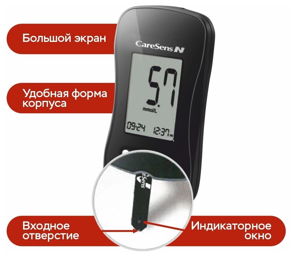 Глюкометр CareSens N (КеаСенс Н). В наборе: тест-полоски 10шт, ланцеты 10шт, 1 ручка-прокалыватель, чехол, журнал учета, инструкция