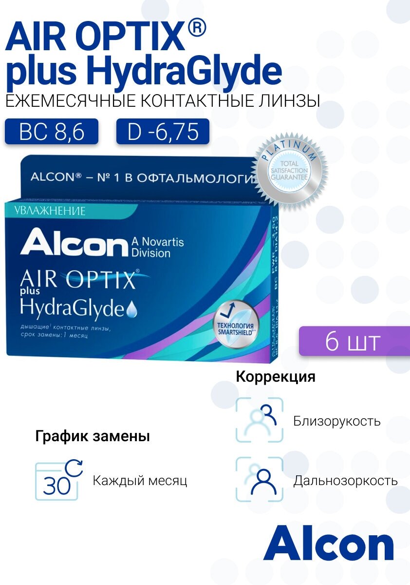 Ежемесячные контактные линзы Alcon Air Optix Plus HydraGlyde 6 pk (BC 8.6; D -6.50)