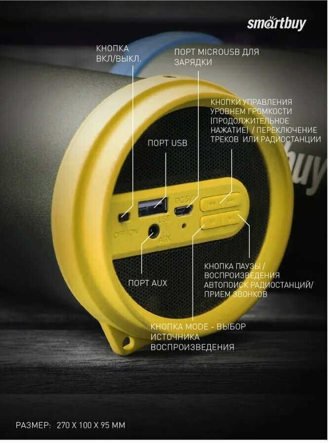 Колонка портативная Bluetooth SmartBuy TUBER MK II, MP3-плеер, FM-радио, черн/желт (арт.SBS-4200)/18