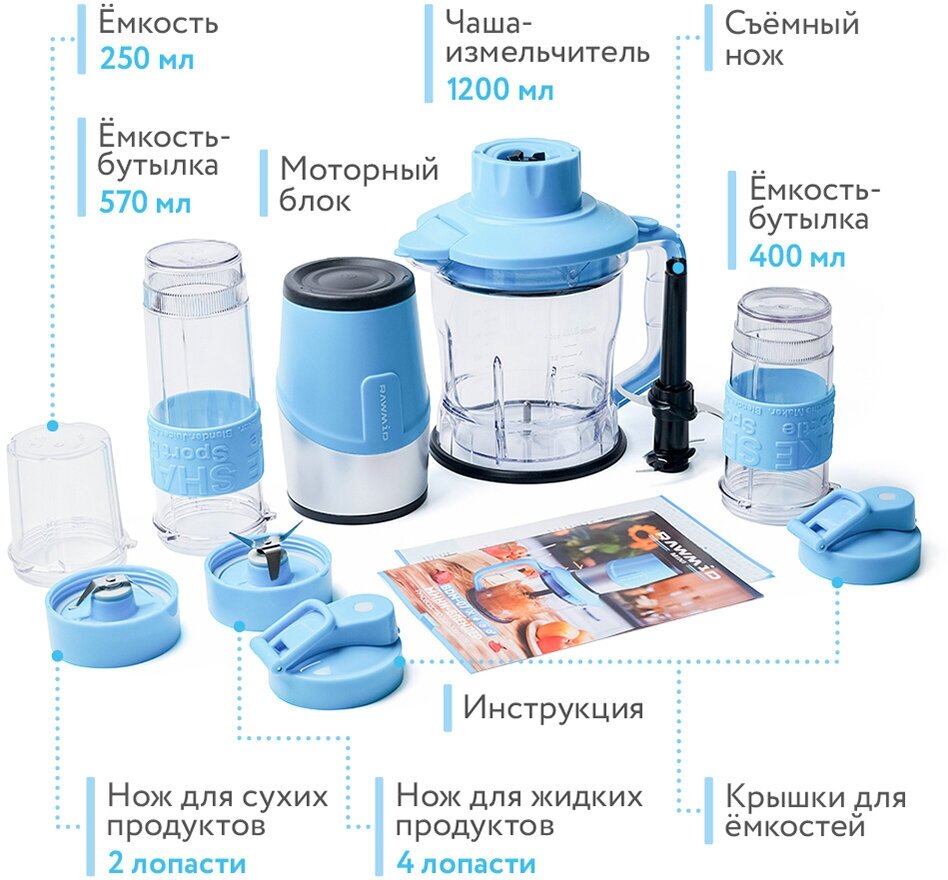 Погружной блендер 3 в 1, 2 скорости, мощность 800 Вт, небесно-голубой