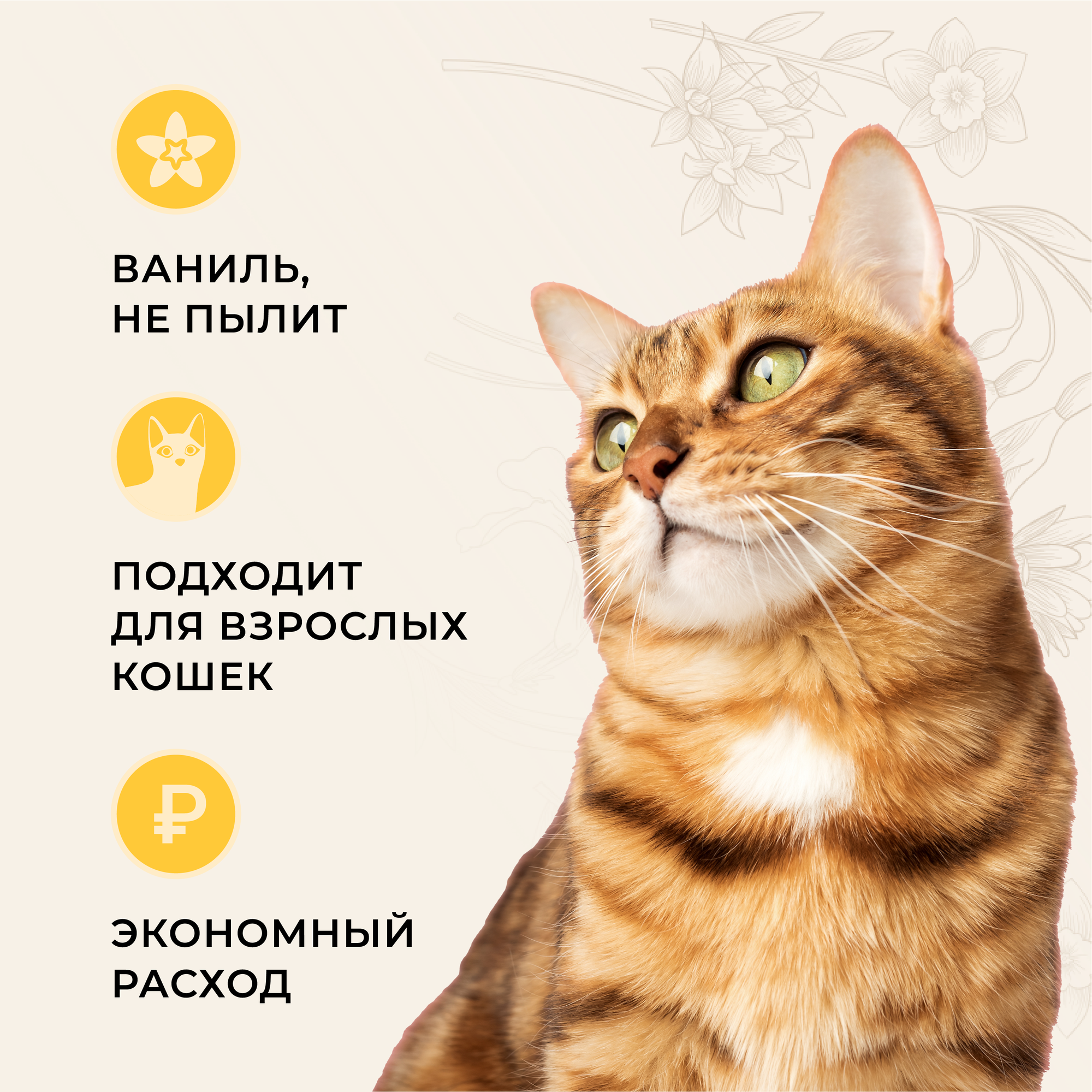 | Особенности | антибактериальный / ароматизированный / гипоаллергенный / гранулированный / контроль запаха / с защитой от запаха |