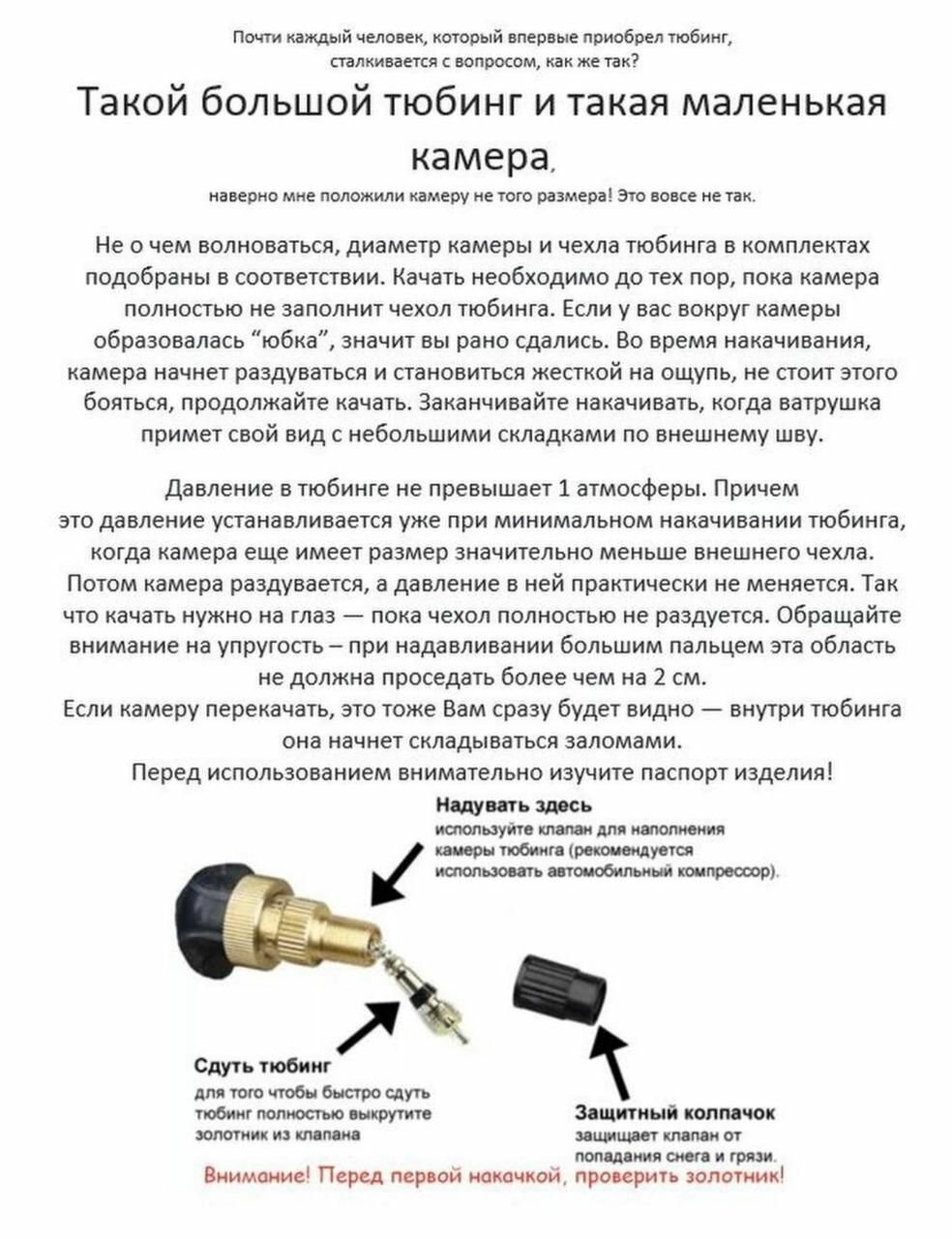 | Минусы: | Резиновая камера меньше самого тюбинга на 10-15 см. Также когда ребёнок сидит на тюбинге, то его попа едет по земле. Возможно если поставить камеру большего размере, то будет все хорошо. |