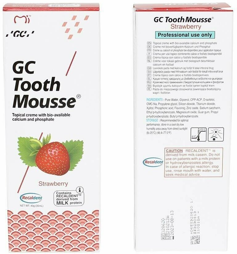 Tooth Mousse клубника, Тус Мусс гель для зубов, для восстановления и укрепления эмали, защиты от кариеса для детей и взрослых, туба 40 г, (GC)