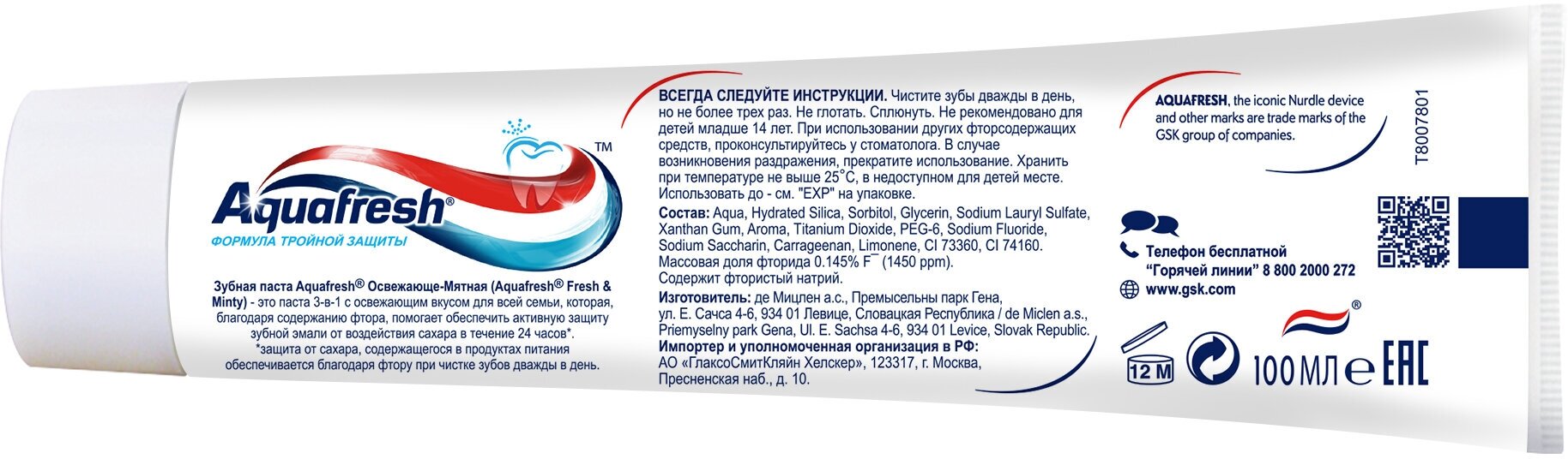 Зубная паста Aquafresh Тройная защита Освежающе-мятная, 100 мл