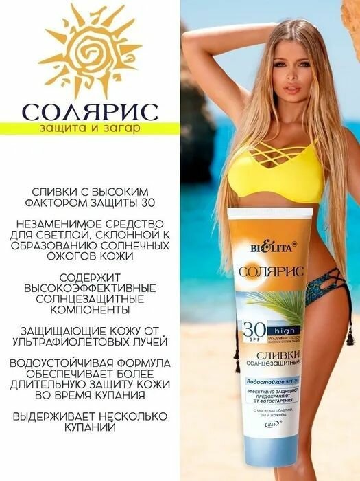 Белита Сливки солнцезащитные Солярис, водостойкие SPF 30 NEW 100 мл