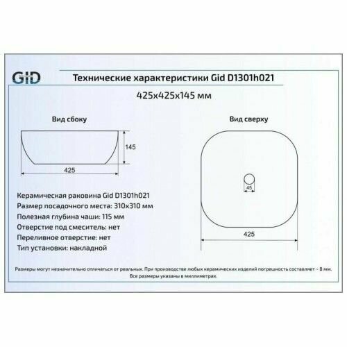 Накладная раковина Gid D1301h021 42.5х42.5 белая с хромом 53302