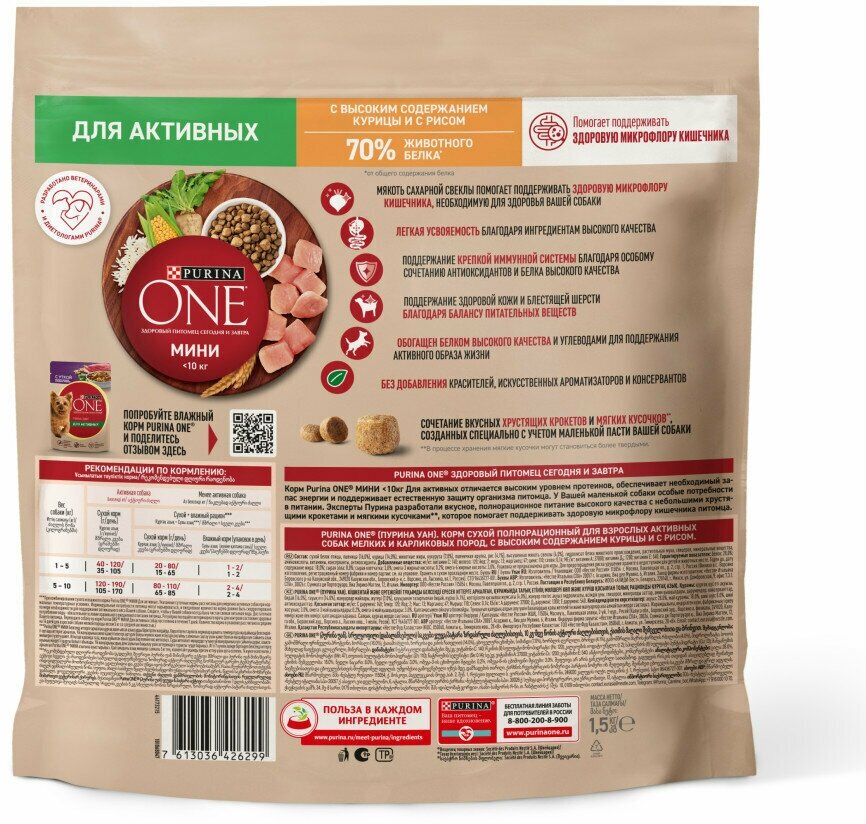 Сухой корм Purina ONE мини Активная для собак мелких пород, с высоким содержанием курицы и с рисом, 1.5 кг