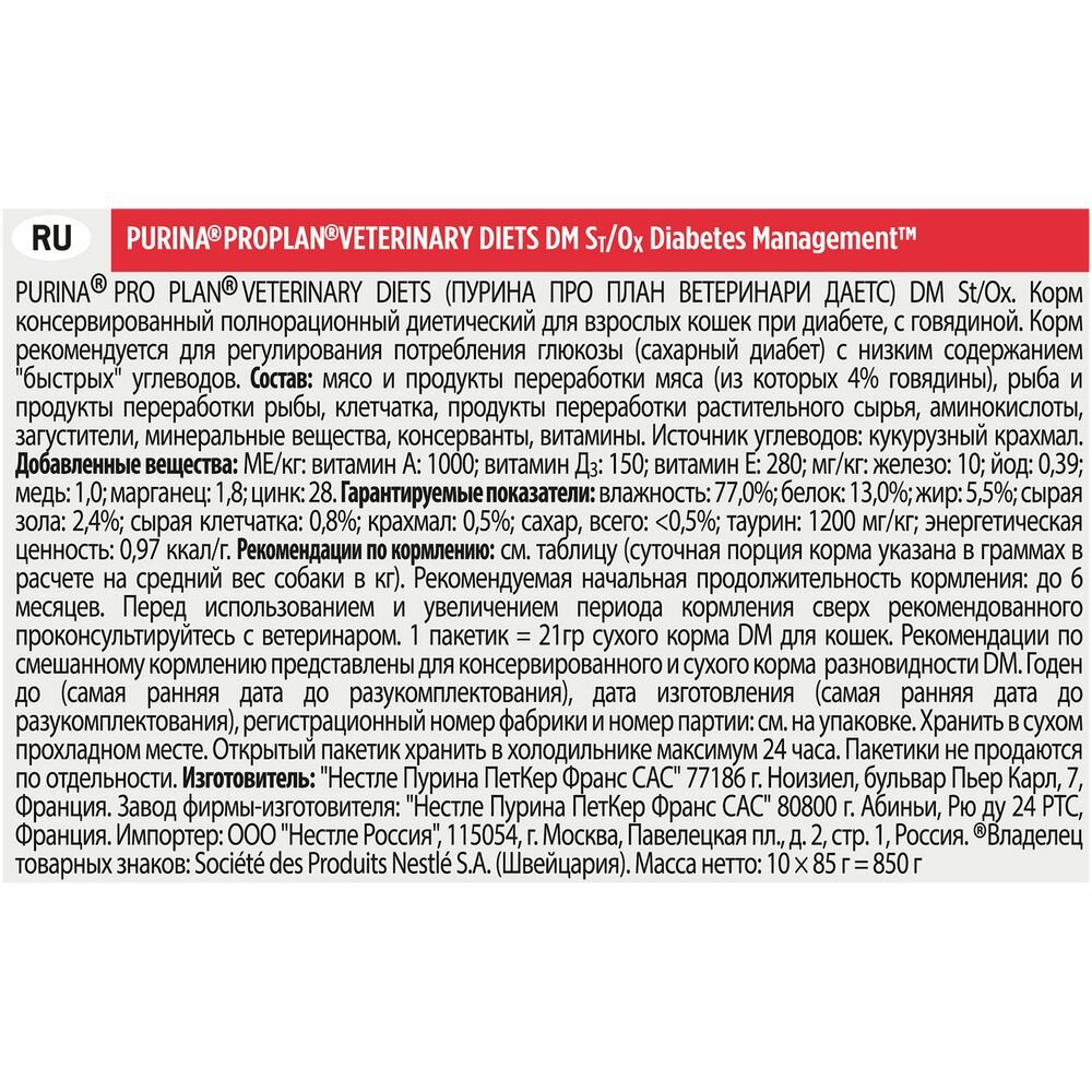 Влажный корм для кошек Purina Pro Plan Veterinary Diets DM St/Ox DIABETES MANAGEMENT, при сахарном диабете, с говядиной, 10 шт. х 85 г
