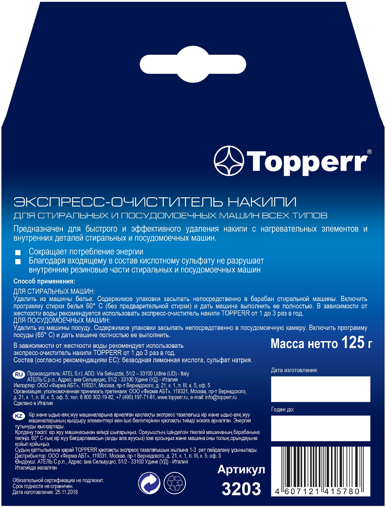 Topperr Экспресс-очиститель накипи для стиральных и посудомоечных машин, 125 г, 1 шт., 3203