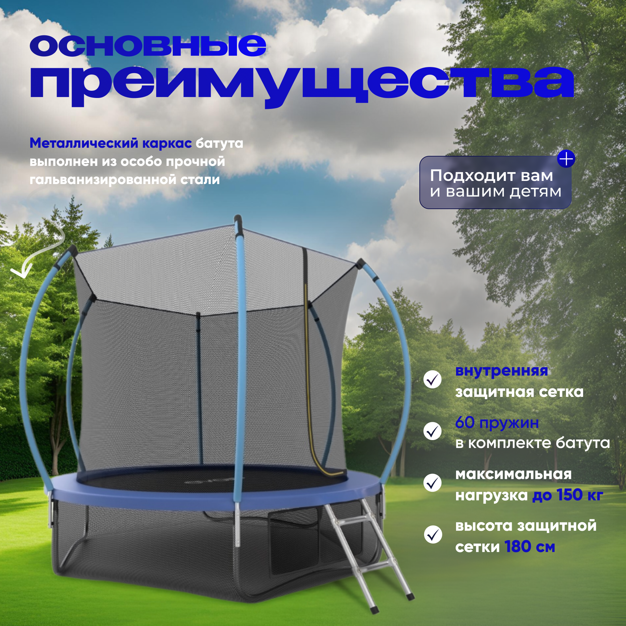 | Плюсы: | Безопасный и надежный батут.