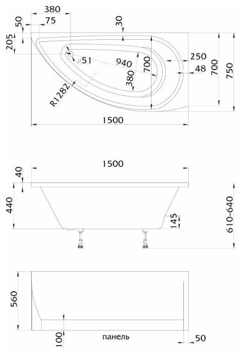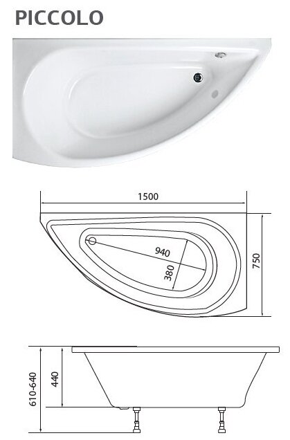 1MarKa Ванна PICCOLO 150x75 без гидромассажа (акрил) угловая, асимметричная, левая/правая