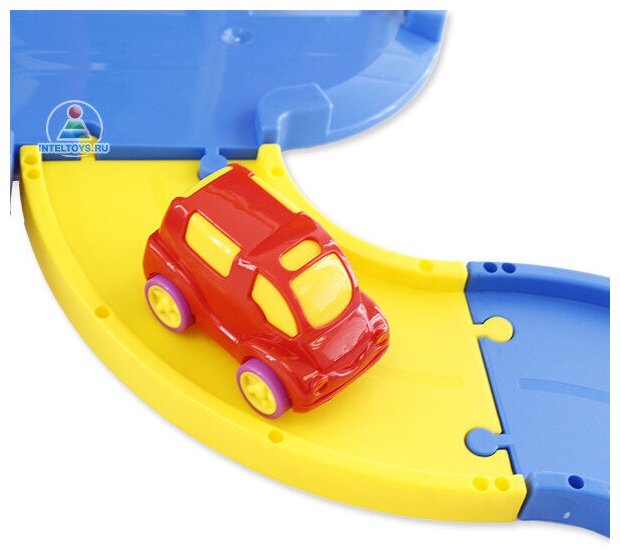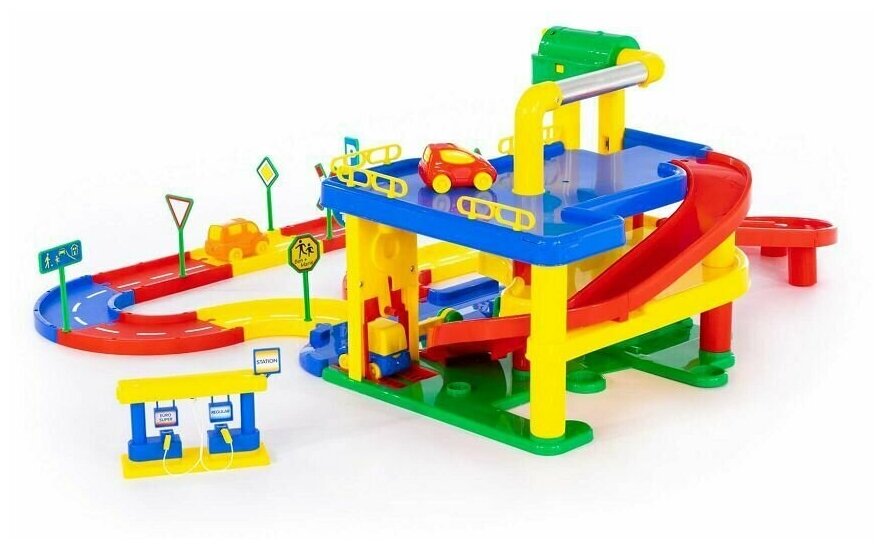 | Комплектация | паркинг в собранном виде (все детали сделаны из прочной гладкой пластмассы ярких цветов, ручка для переноски – из металла), большая дорога из разноцветных деталей; наклейки для декора, 10 знаков дорожного движения, 3 машинки |