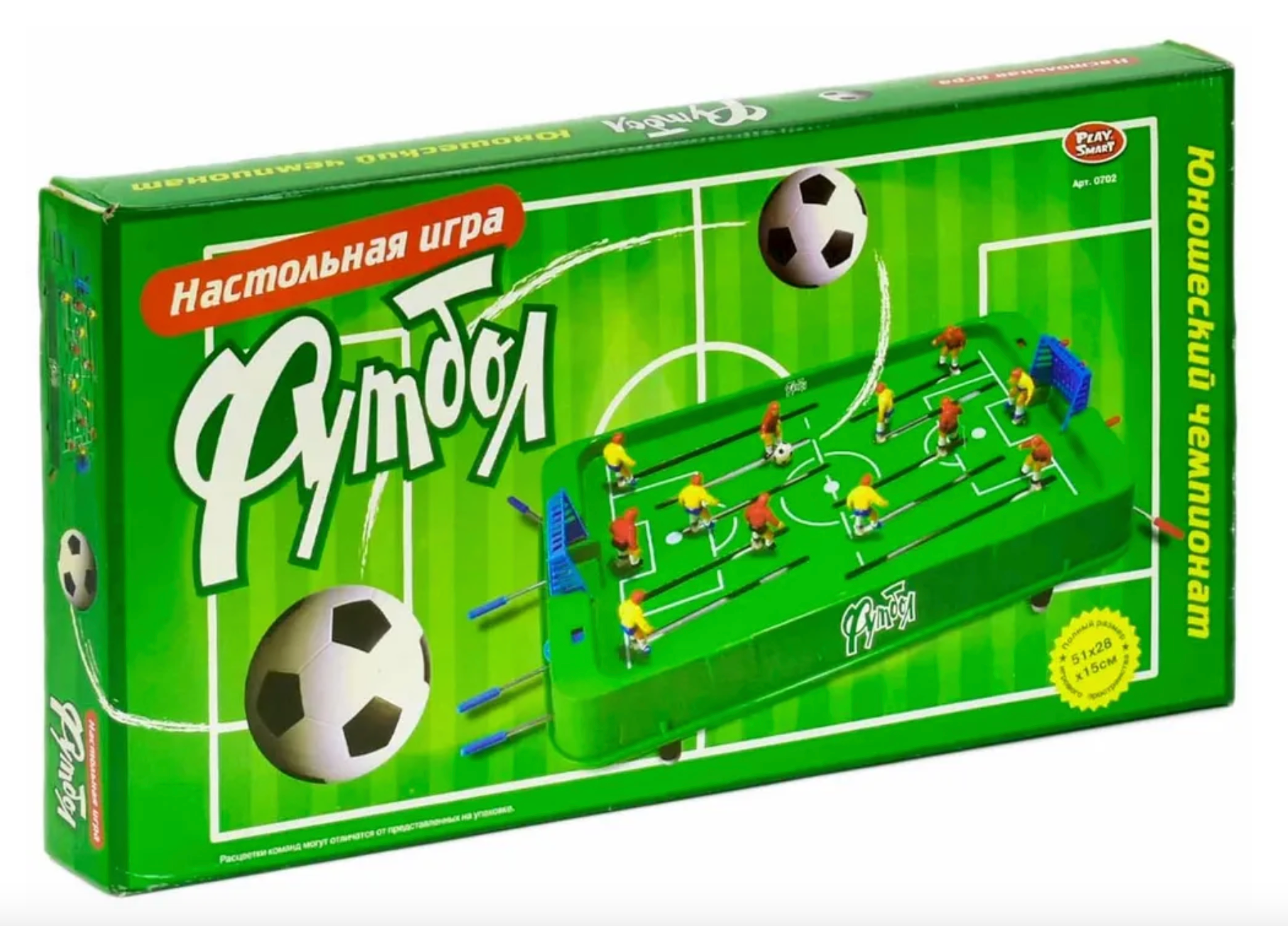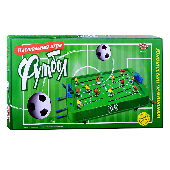 | Комплектация | игровая площадка - 1 шт. ножки для поля - 4 шт. фигурка "Футболист" - 12 шт. ворота - 2 шт. мяч - 1 шт. наклейки правила игры - 1 шт. коробка - 1 шт. |
