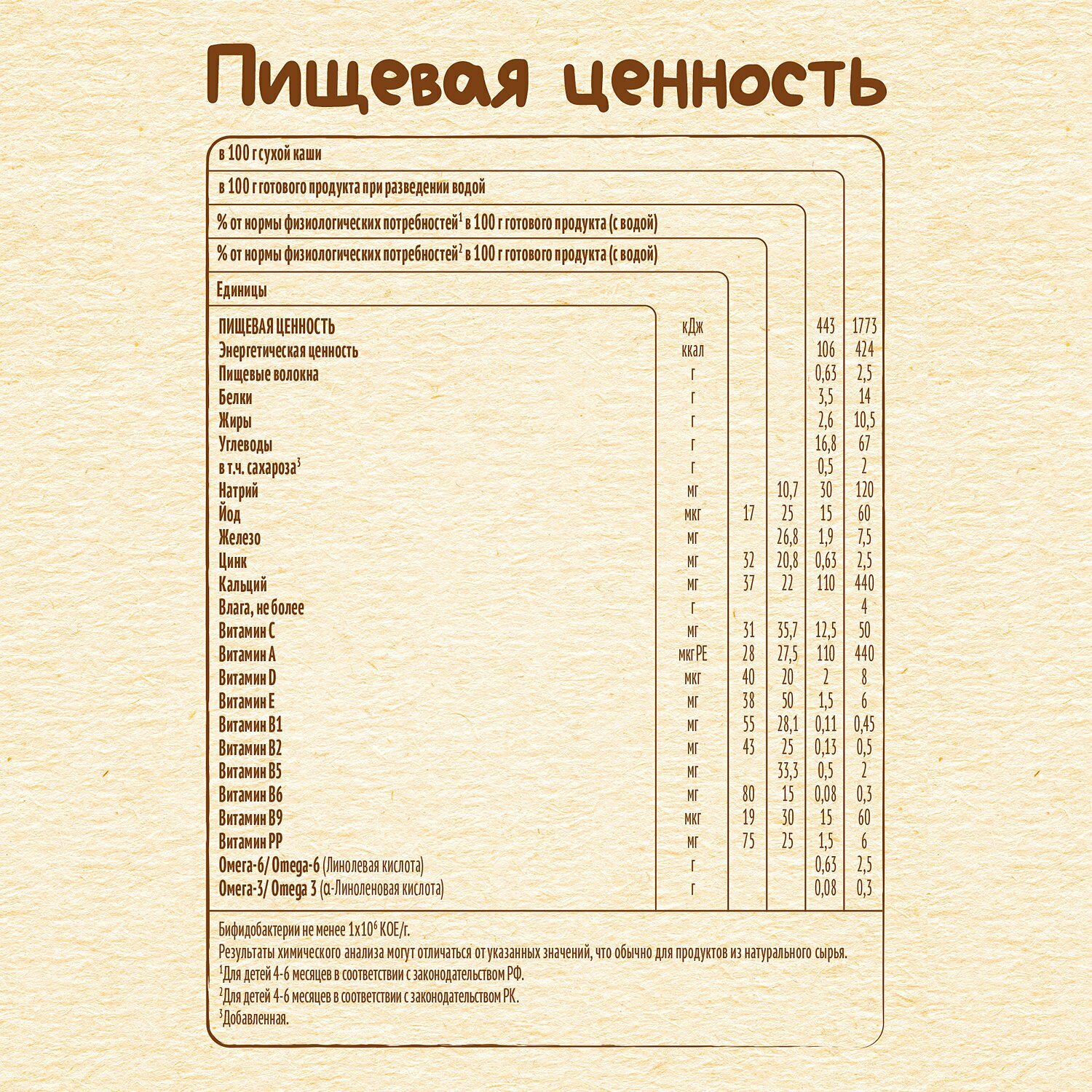 | Состав | гречневая мука, молоко сухое обезжиренное, пальмовый олеин, мальтодекстрин, сахар, витамины и минеральные вещества, бифидобактерии не менее 1х10⁶ КОЕ/г |