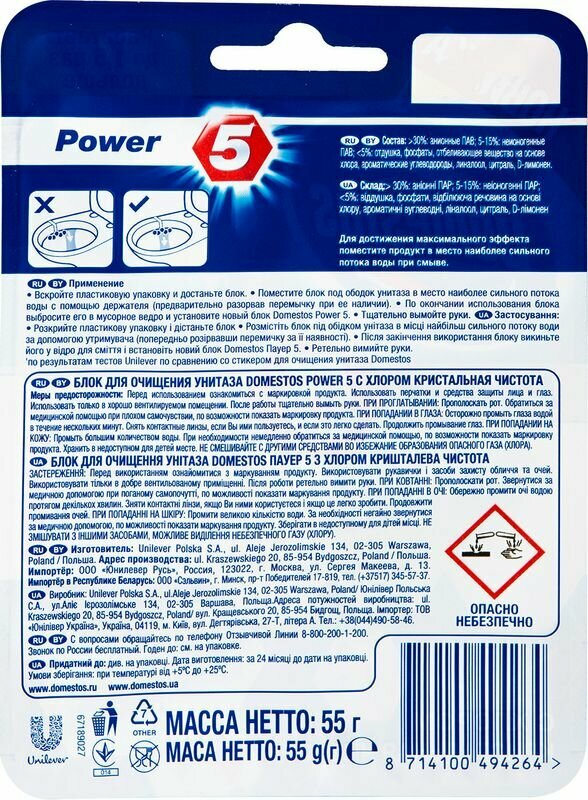 СохранитьСменный туалетный блок Domestos для очищения унитаза, Power 5, с хлором, Кристальная чистота, 55 гр (67253005) интересное: