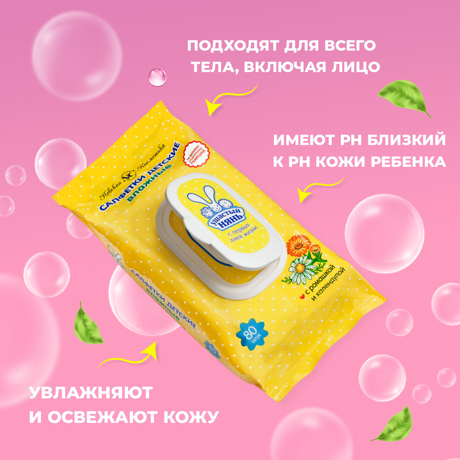Влажные салфетки Ушастый Нянь Ромашка и календула, пластиковая крышка, 80 шт.