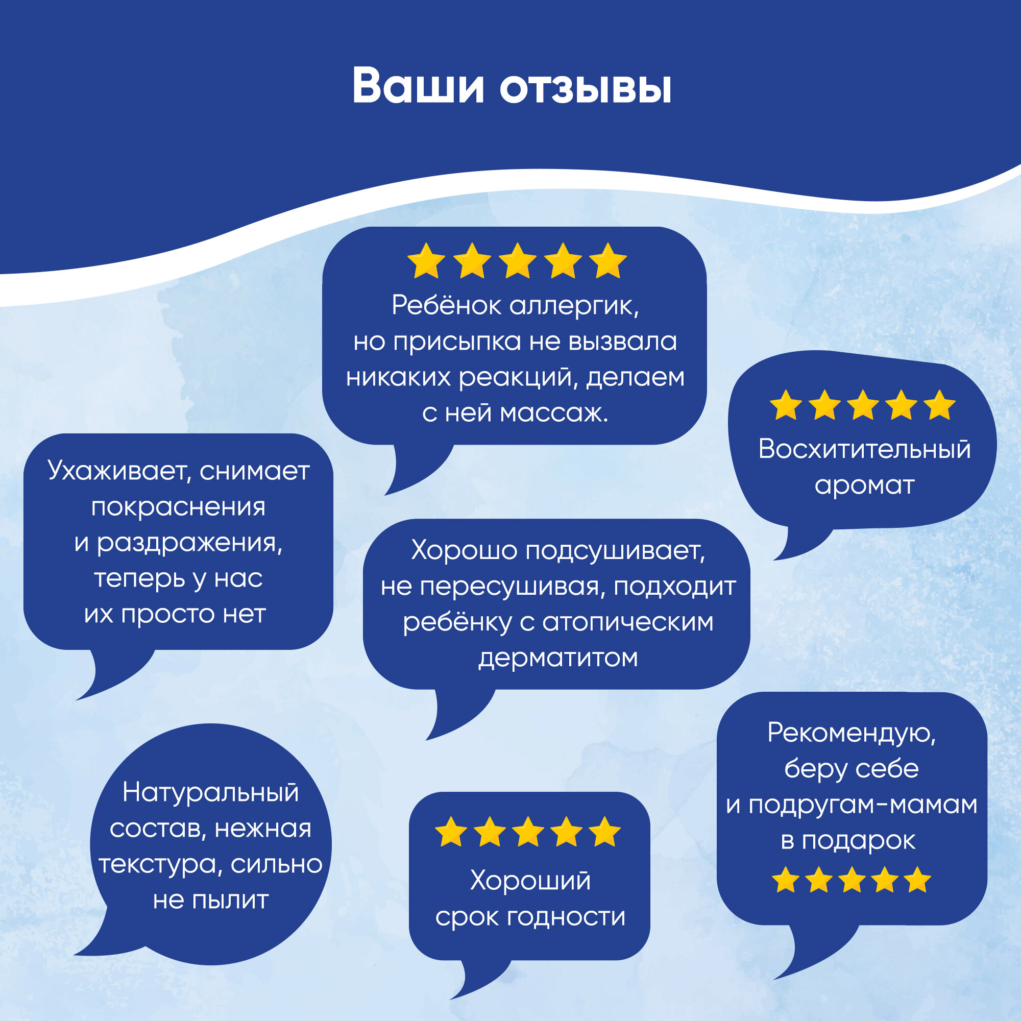 | Отзыв: | В состав присыпки входят исключительно натуральные компоненты, которые помогают сохранять кожу сухой.