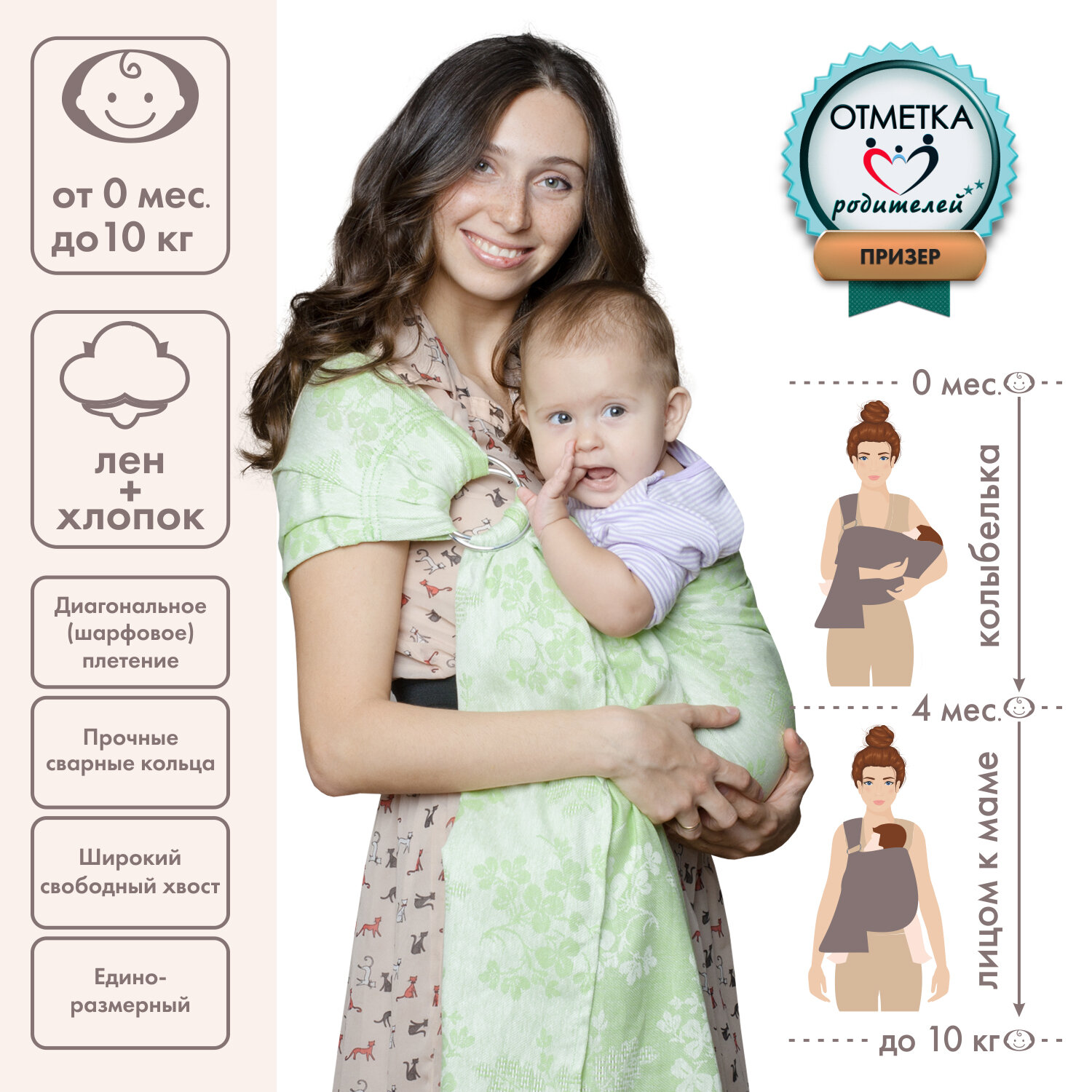 | Плюсы: | Носили младенца до 4-х месяцев постоянно в этом слинге. Колики и прочее замучили, а в слинге успокаивался. Почаще меняла плечо, спина не уставала. Ткань приятная на ощупь, летом было не жарко. Кольца надежные на мой взгляд. Я рекомендую данный слинг. |