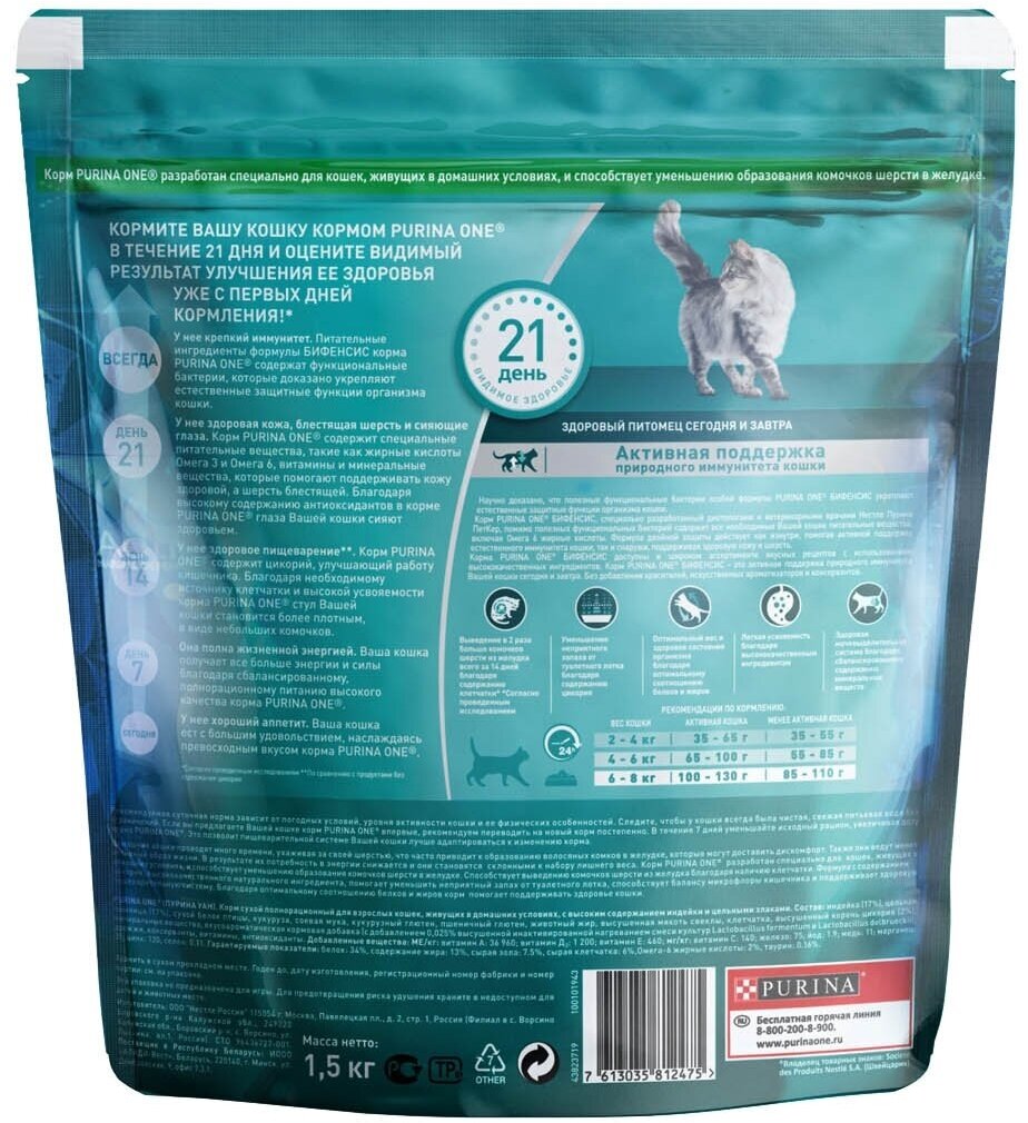 PURINA ONE 1,5 кг сухой корм для взрослых кошек, живущих в домашних условиях, с высоким содержанием индейки и цельными злаками