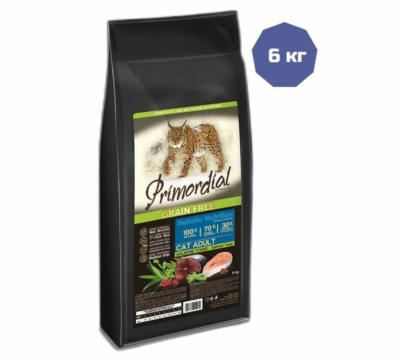 Сухой корм для кошек Primordial беззерновой, с лососем, с тунцом 6 кг