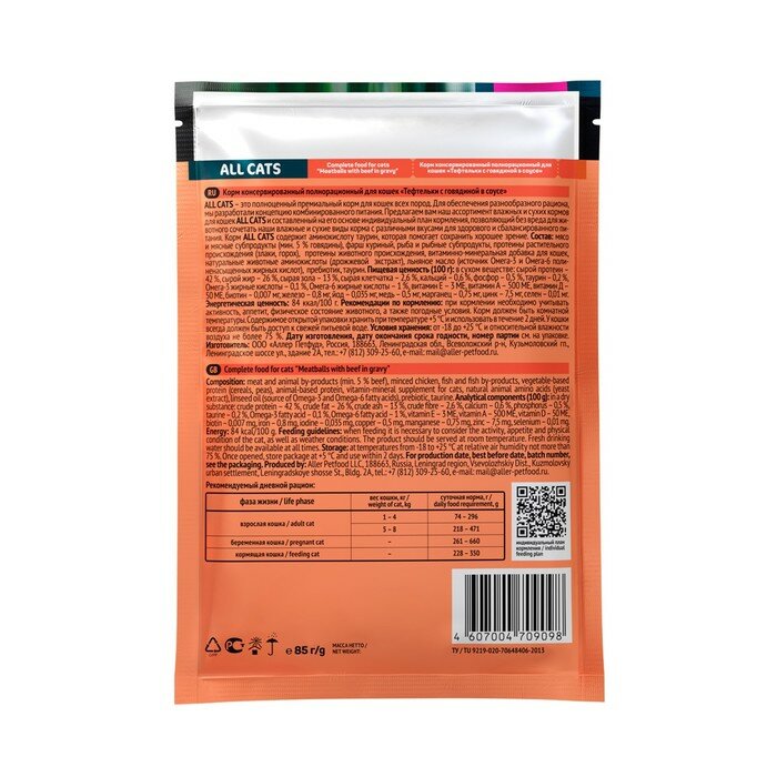 Влажный корм All cats для кошек, тефтельки с говядиной в соусе, пауч, 85 г интересное: