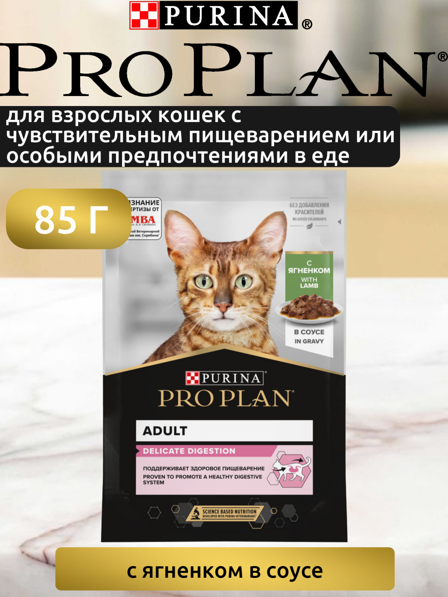 Влажный корм Pro Plan DELICATE для взрослых кошек с чувствительным пищеварением или особыми предпочтениями в еде, с ягненком в соусе, паучи, 85г.*12шт.