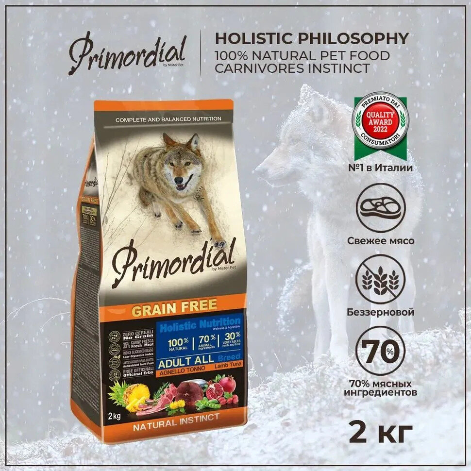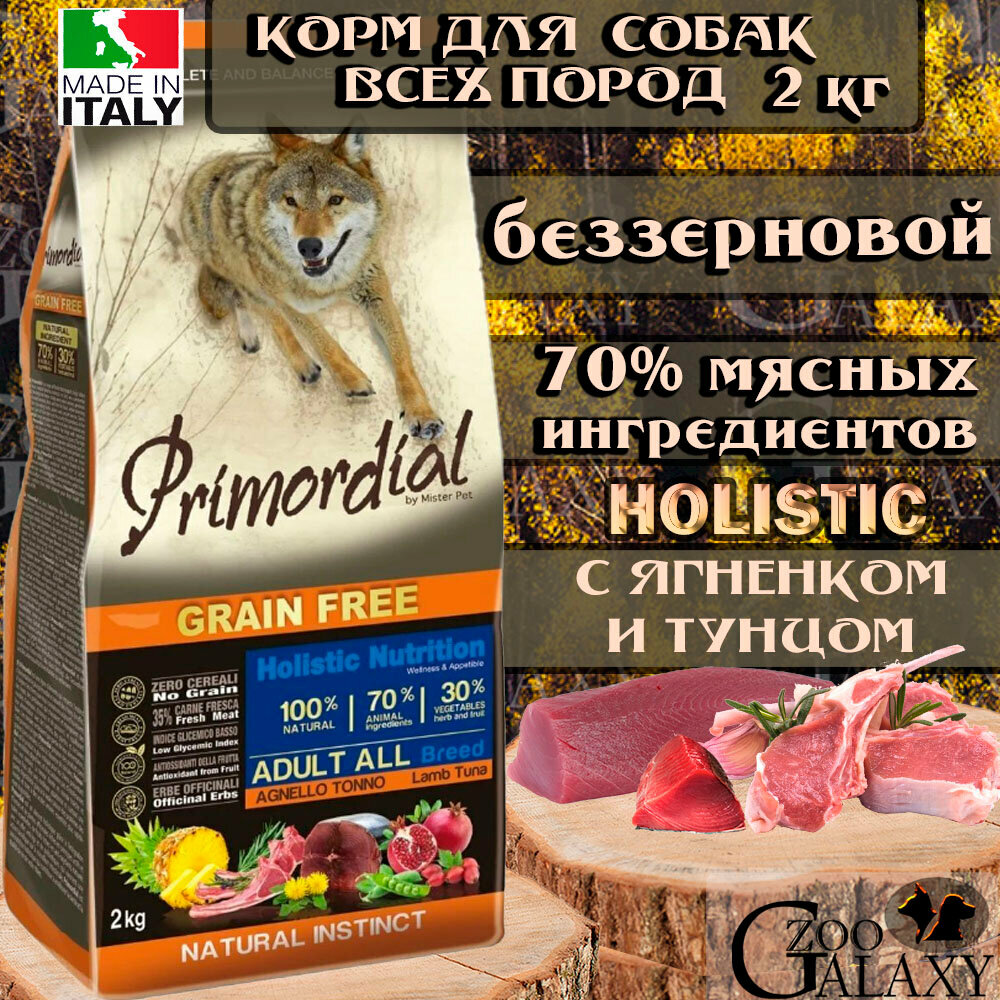 PRIMORDIAL Сухой корм для собак беззерновой, тунец, ягненок, 2 кг, PRIMORDIAL