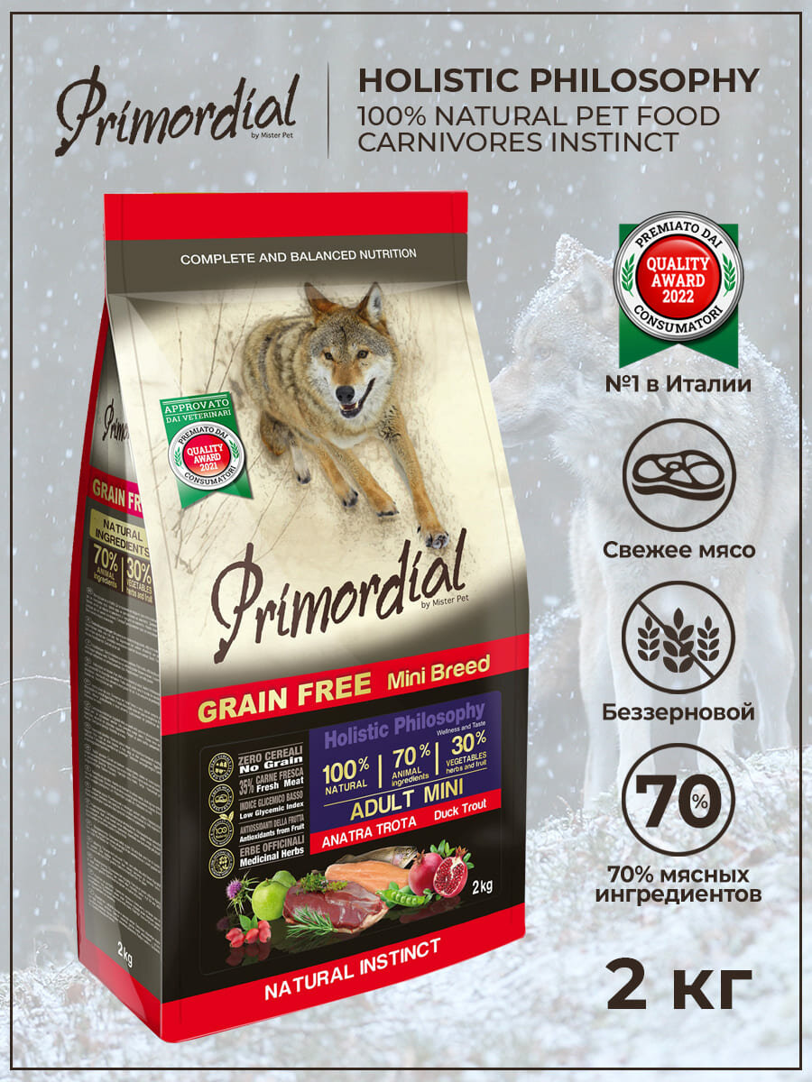 Сухой корм для собак мелких пород Primordial беззерновой, форель, утка 1 уп. х 1 шт. х 2 кг (для мелких пород)