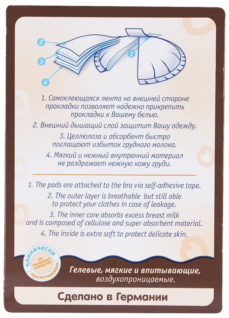 Крепко держатся за счет 2х липких лент Отлично впитывают большие объёмы и не протекают (проверено на очень обильной лактации) Цена на беру за большую пачку самая низкая в сравнении с другими фирмами (именно гидрогелевыми) |