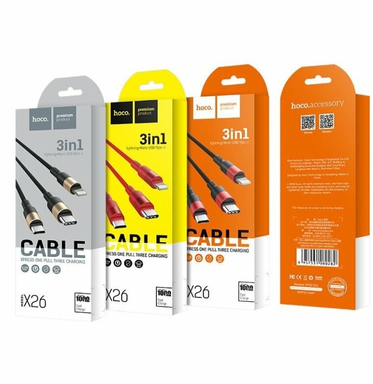 Ниже Вы можете прочитать отзывы на Кабель USB HOCO X26 Xpress 3 в 1 для Lightning, Micro USB, Type-C, 2.0A, длина 1,0 м / цвет черный с золотым, ознакомится с подробными характеристиками, посмотреть интересные обзоры и фотографии на Кабель USB HOCO X26 Xpress 3 в 1 для Lightning, Micro USB, Type-C, 2.0A, длина 1,0 м / цвет черный с золотым.