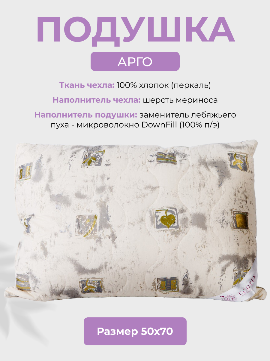 Подушка 50x70 см "Арго", чехол - перкаль (100% хлопок), Ecotex интересное: