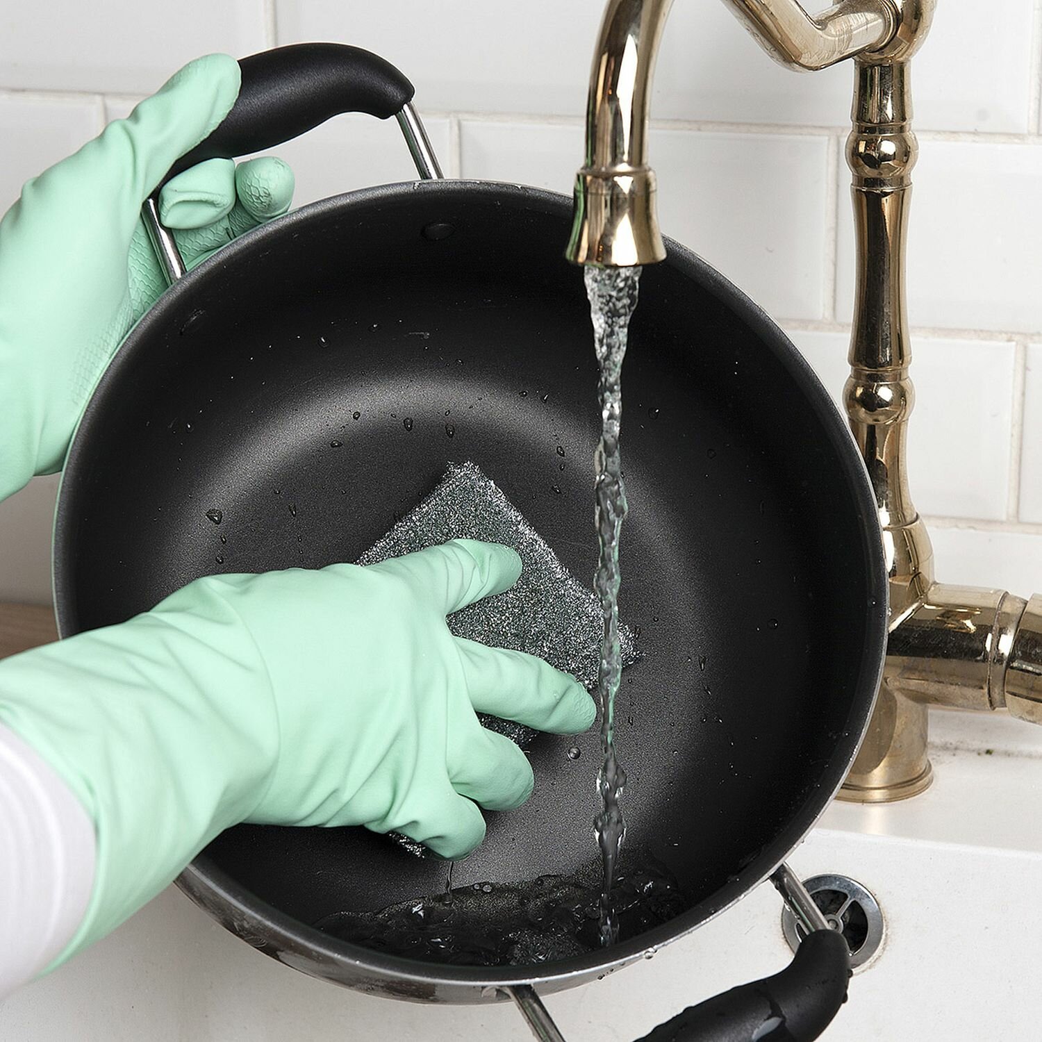 Помогает отмыть сильные загрязнения. Недостатки: Может оставлять небольшие потёртости на тефлоне. Лучше использовать для мытья посуды из нержавеющей стали. |