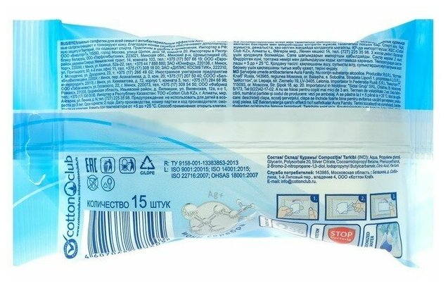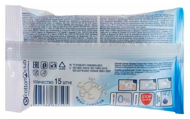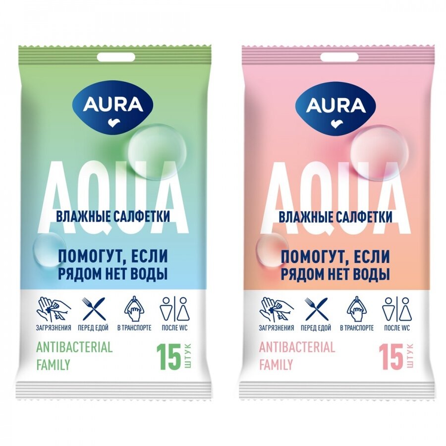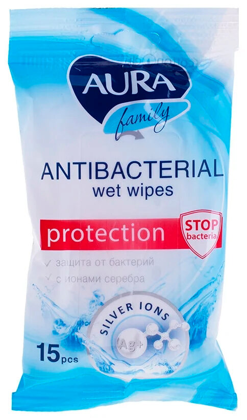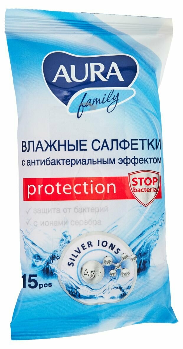 Aura Салфетки влажные для всей семьи с антибактериальным эффектом и ионами серебра, 15 шт