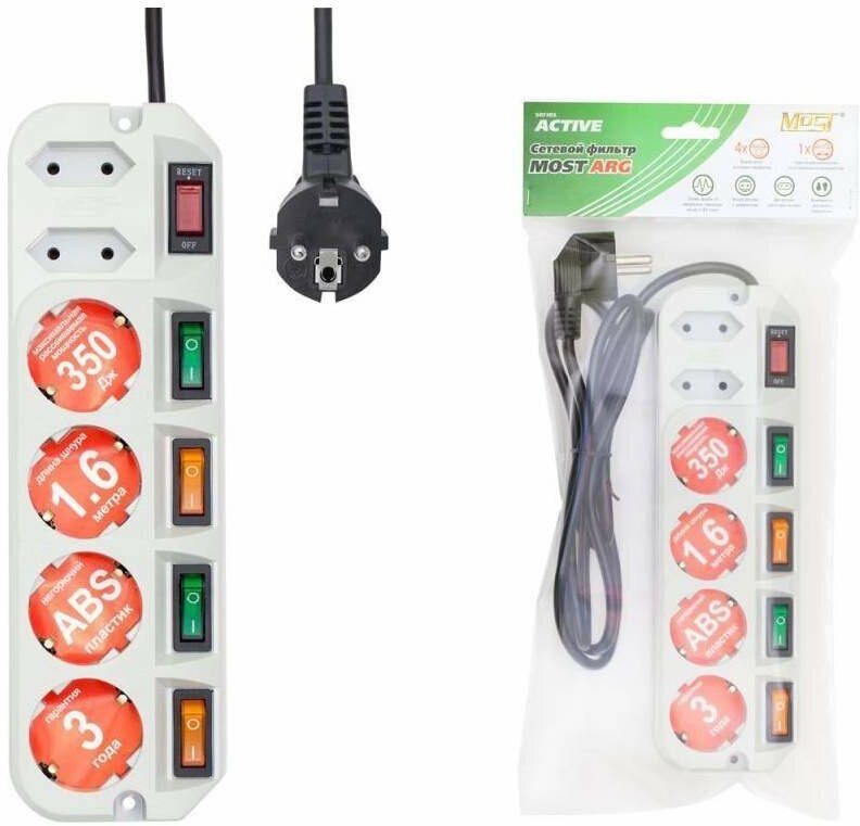 Удлинитель MOST Active A16, 6 розеток, с/з, 16А / 3500 Вт белый 1.6 м 250 мм 75 мм 45 мм 1 м² 6