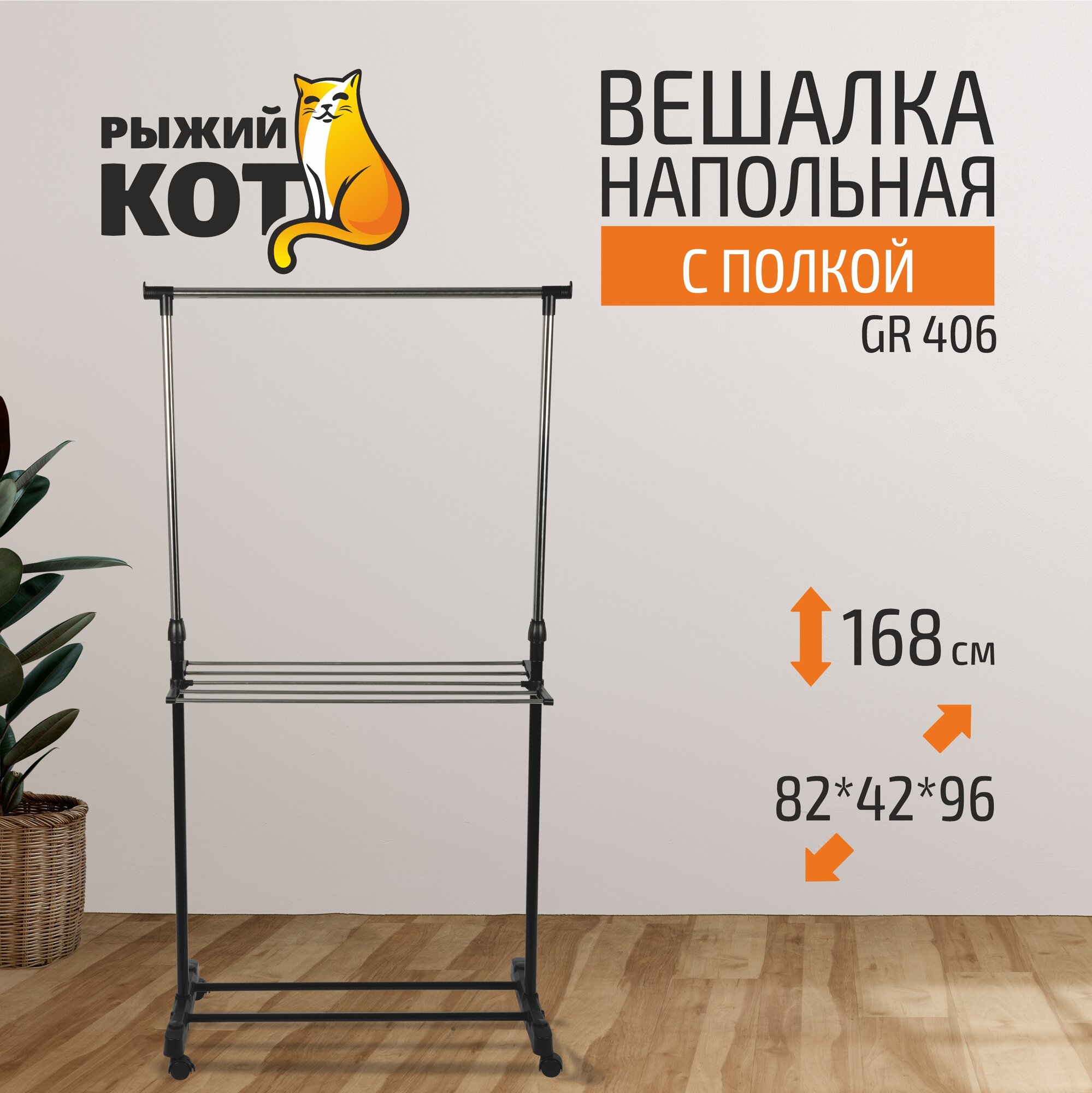 Вешалка напольная Рыжий кот CR460 с полкой (на колесах), 80 x 42 x 95-168 см