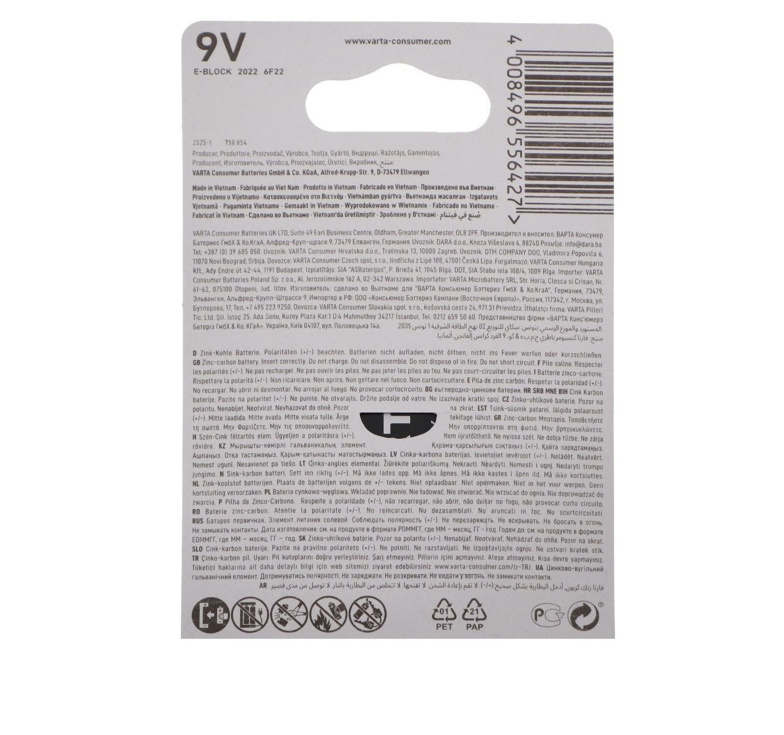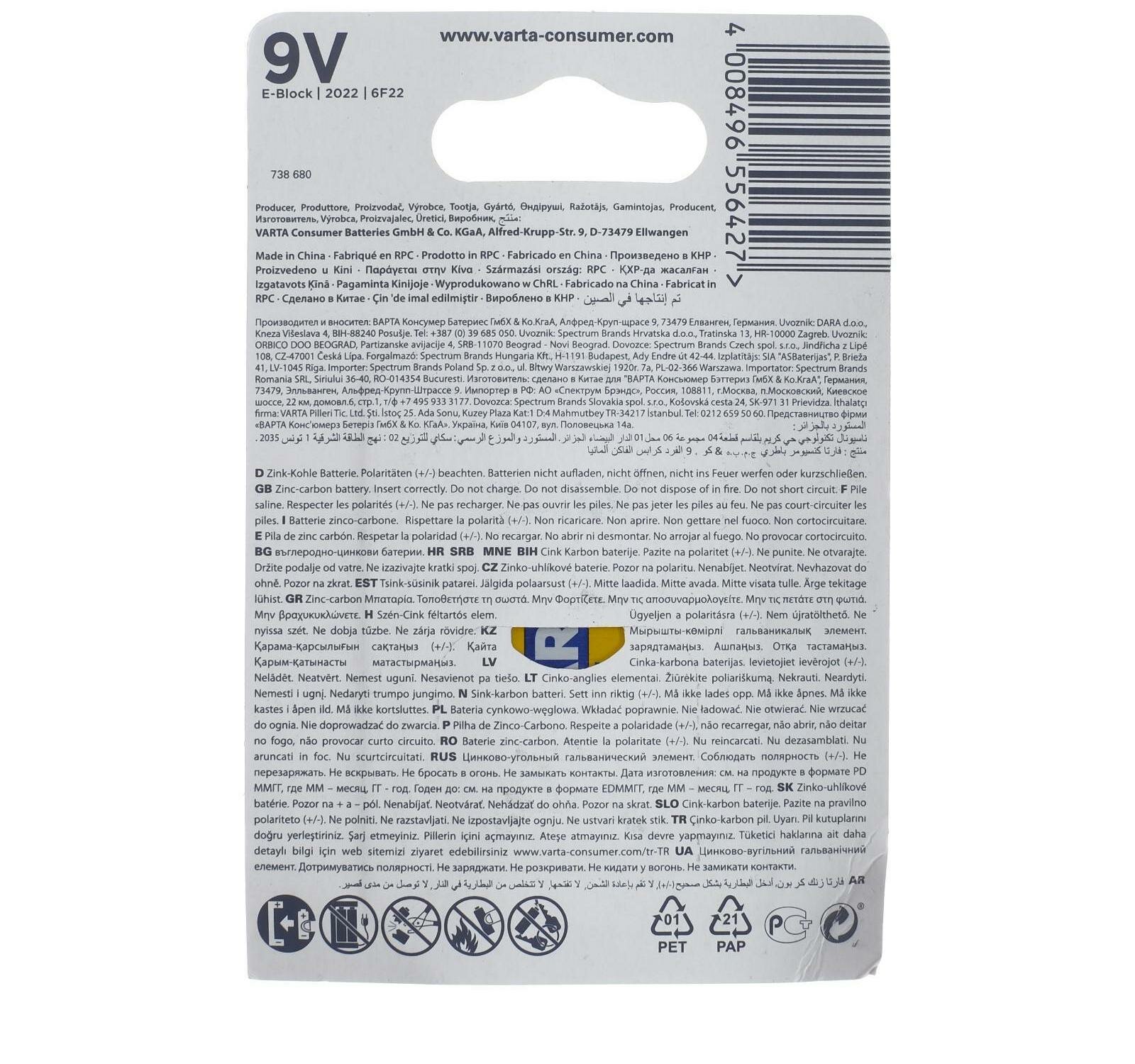 Батарейка солевая Varta SuperLife, 6F22-1BL, 9В, крона, блистер, 1 шт. интересное: