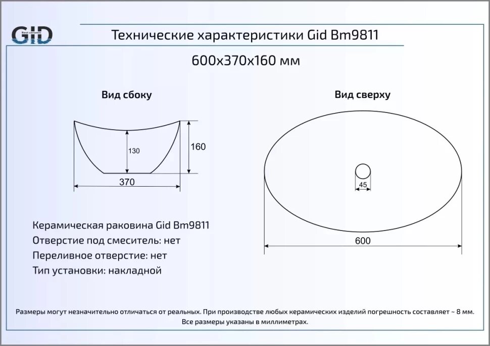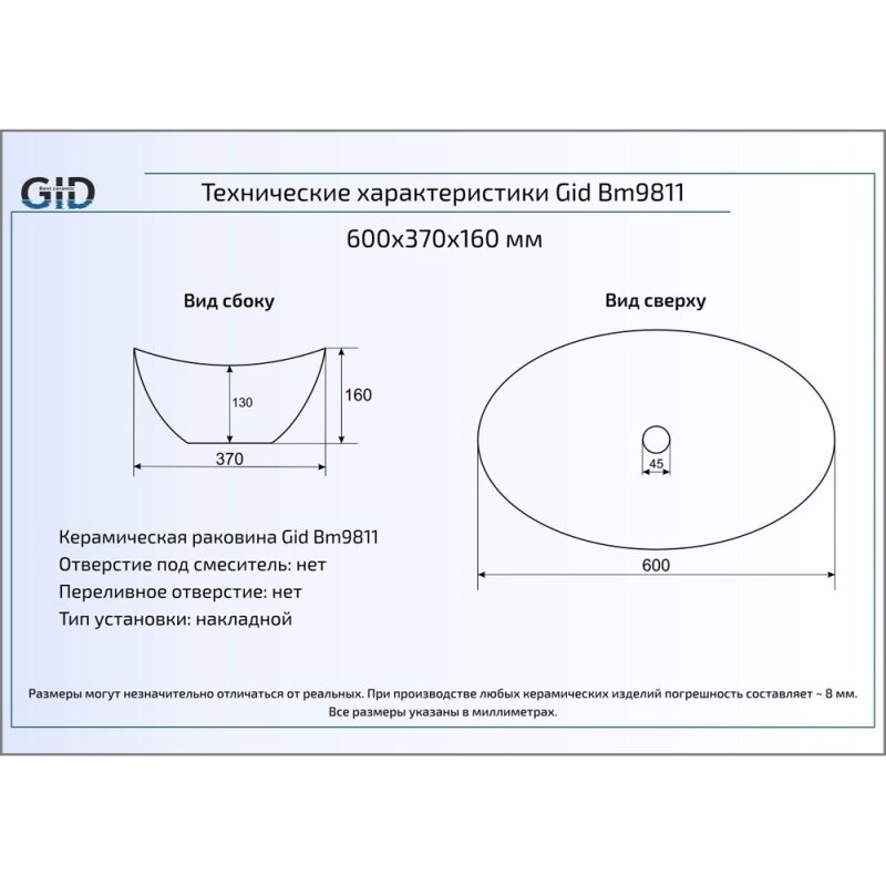 Накладная раковина Gid Bm9811 61х37 черная, матовая 53337