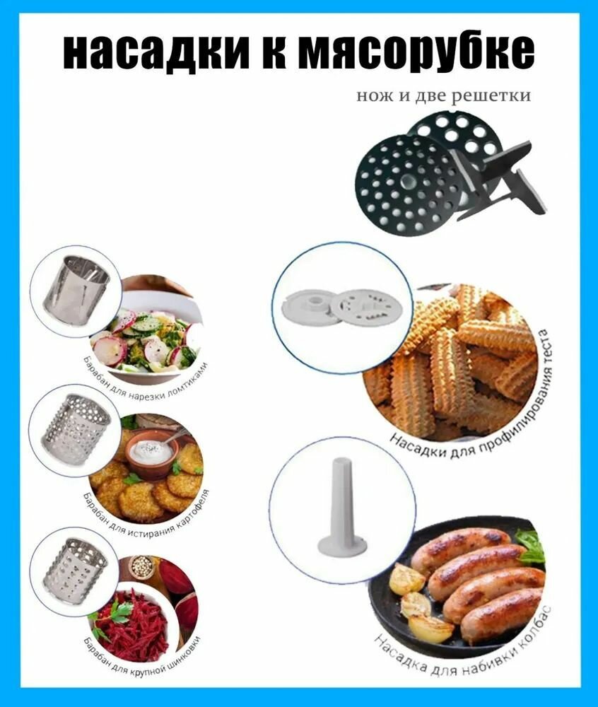 | Плюсы: | недорогой агрегат, металлический корпус, реверс, много насадок, легко моется, подходят нож и решетка от ручной мясорубки, быстро мелет и замороженное, приемлемый шум |