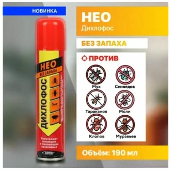 Средство от насекомых 190 мл дихлофос НЕО, без запаха, от всех видов насекомых, аэрозоль В комплекте: 1шт.