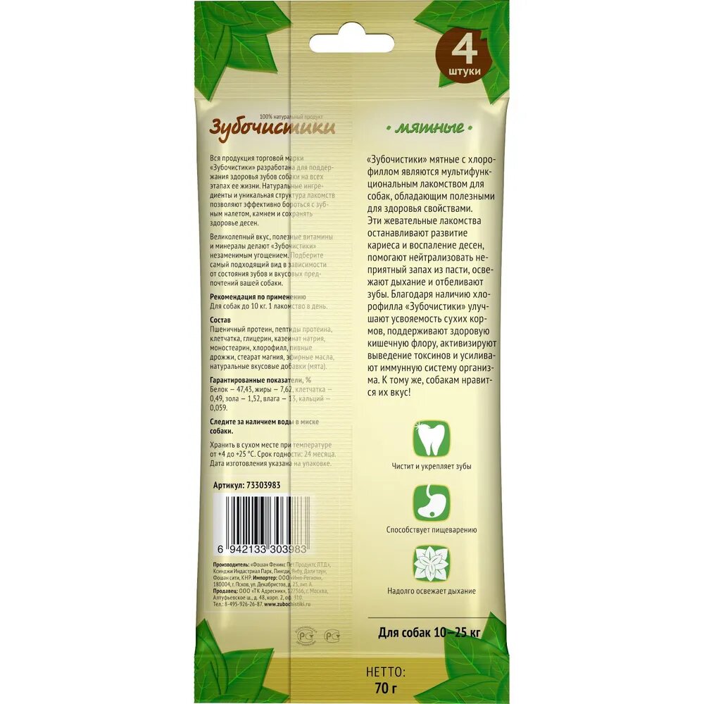 Лакомство для собак Зубочистики Мятные с хлорофиллом для средних пород, 70 г, 4 шт в уп.