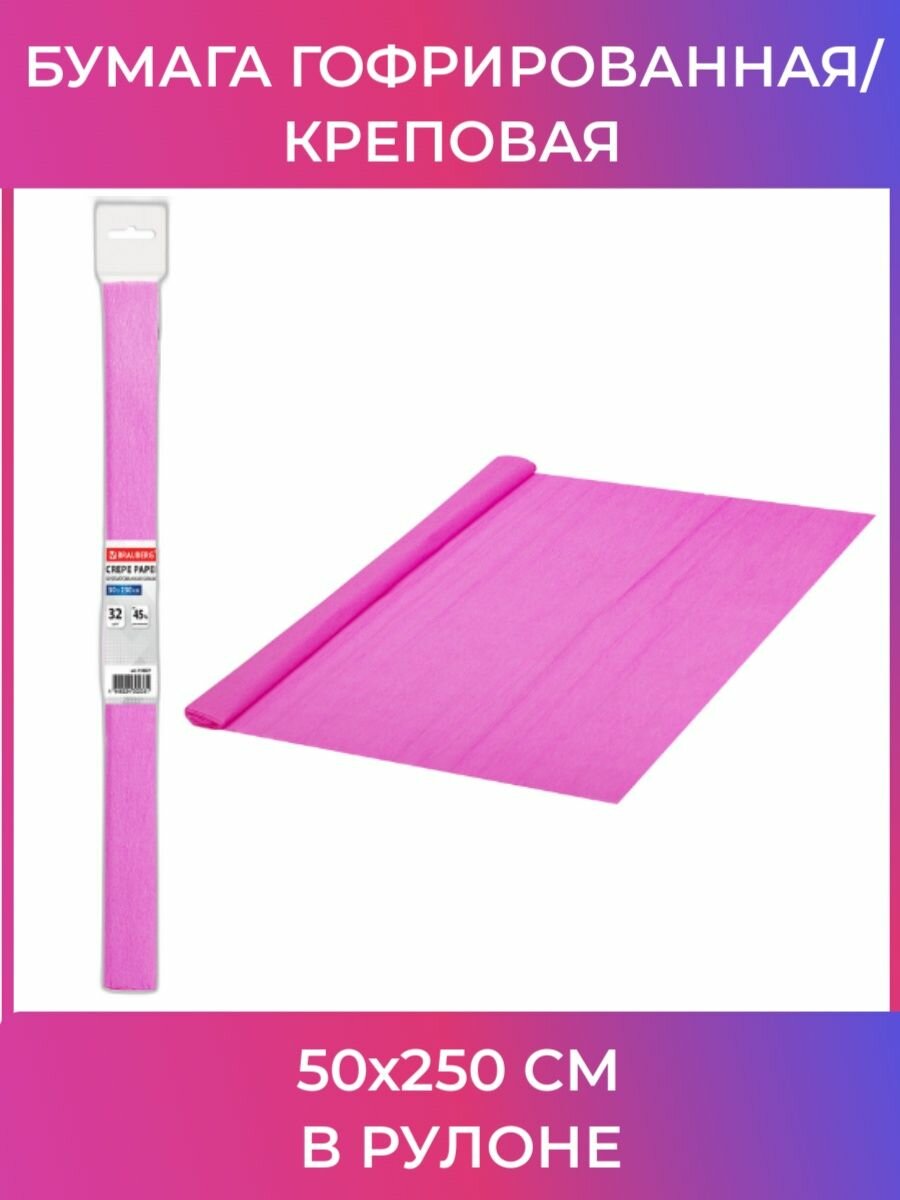 Бумага гофрированная/креповая, 32г/м2, 50х250см, фуксия, в рулоне, BRAUBERG, 112518