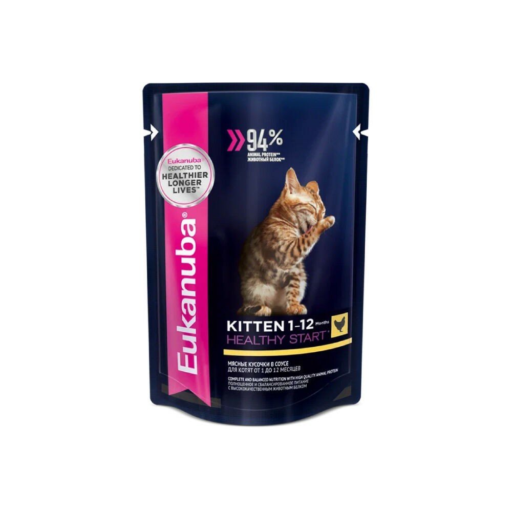 Влажный корм для котят Eukanuba Kitten Healthy Start, для здоровья кожи и блеска шерсти, c курицей, 12 шт. х 85 г (кусочки в соусе)