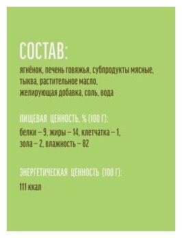 Деревенские лакомства консервы "Домашние обеды ягнёнок с печенью и тыквой" для собак мини пород Ягненок и печень, 100 г. упаковка 5 шт