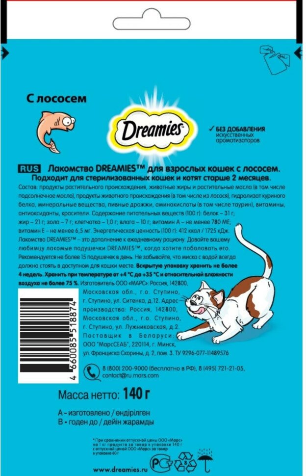 Dreamies лакомство для кошек, подушечки с лососем (6шт в уп) 60 гр