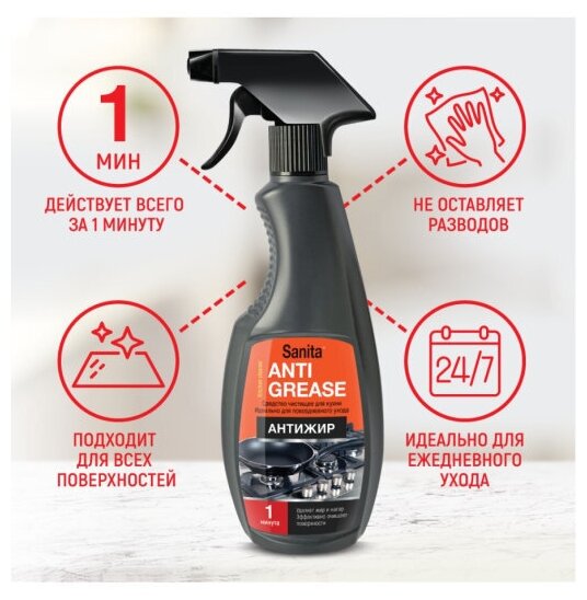 Набор чистящих средств для кухни Sanita спрей очиститель Антижир "1 минута", 500 мл (4 шт)