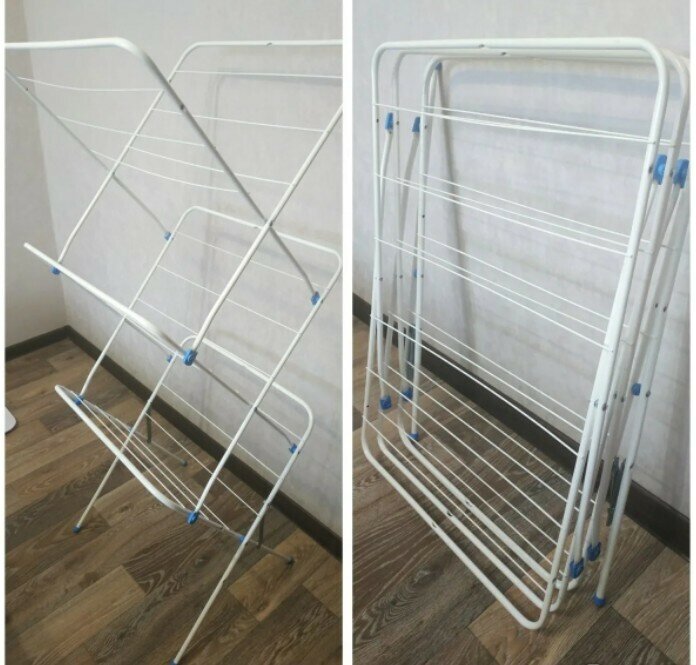 | Минусы: | Качество материала очень огорчило, при попытке разложить и зафиксировать, я погнула ножку, даже не приложив усилий... Ширина сушильного места на одну футболку взрослого человека. Для семьи хотя бы из двух взрослых не подойдёт. Купили за 980р,в магазине дороже 500р за такую бы не отдала |