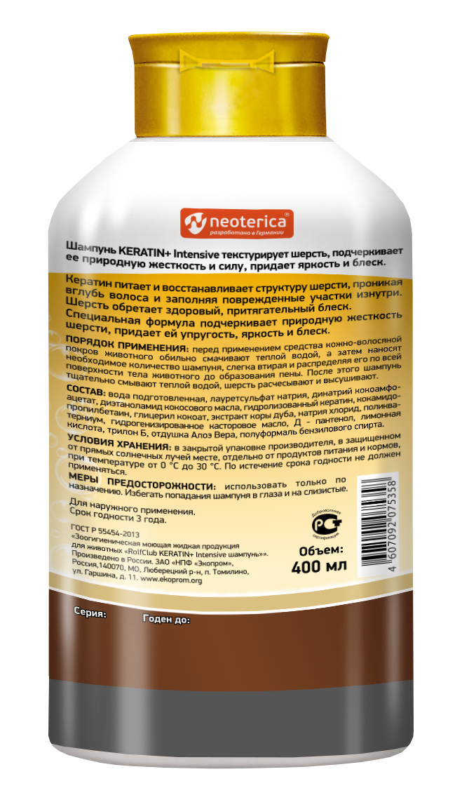 Шампунь для жесткошерстных кошек и собак, RolfClub KERATIN+ Intensive, 400мл
