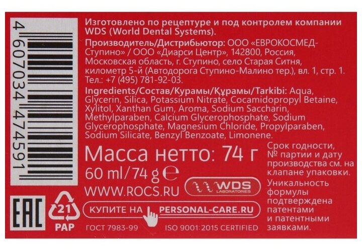 | Минусы: | Будьте осторожны! Паста заявлена для чувствительных зубов, но по факту она усиливает эту самую чувствительность, портит эмаль. Испортила мне и многим другим людям (почитайте настоящие отзывы в Интернете- на всю продукцию немало жалоб). Это "особенность" всех паст Рокс. Положительные отзывы на многих сайтах - работа троллей, маркетинговых отделов. Ни к какой Швейцарии (как написано на упаковке) Рокс отношения не имеет, производится она в России. |