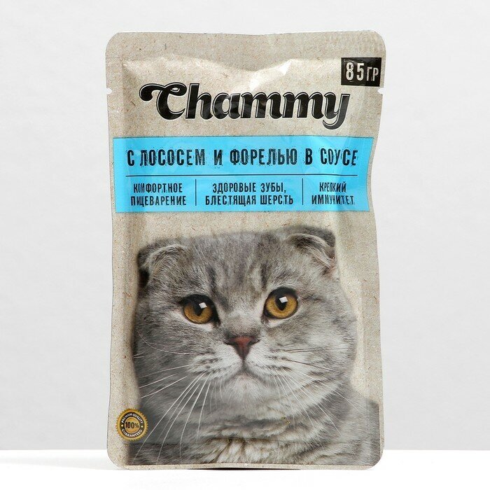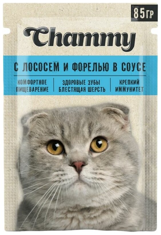 Влажный корм Chammy для кошек, лосось/форельxсоусе, пауч, 85 г интересное: