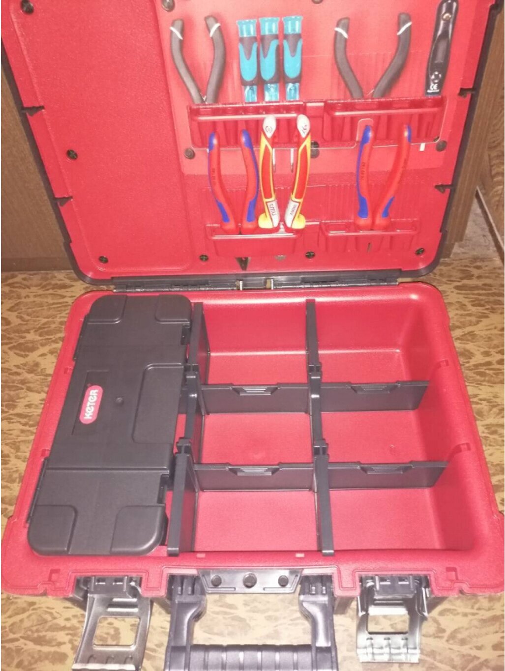 | Плюсы: | Очень удобный кейс для хранения и транспортировки инструментов электрика и возможно других. Герметичен, есть съемные перегородки, с внутренней стороны крышки крепления разного размера для хранения отверток и разных кусачек, плоскогубцев. Есть органайзер для мелочей. Замки металлические. Подходят маленькие пластиковые контейнеры- боксы для мелочей из Леруа Мерлена за 28?. Видел такой кейс под разными марками, раньше продавался в Кастораме по маркой MacAlister и дешевле на около 1000?. Храню в нем все инструменты для работы с электрикой(зачистка кабеля, обжим наконечников, отвертки диэлектрические, плоскогубцы, кабелерезы, кусачки, наконечники НШВИ, контакты WAGO, стяжки и др. Всё в одном месте- очень удобно. |